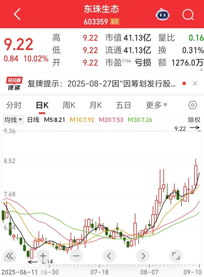 9月10日,东珠生态(603359.SH)复牌涨停,股价报9.22元/股,市值为41.13亿元。