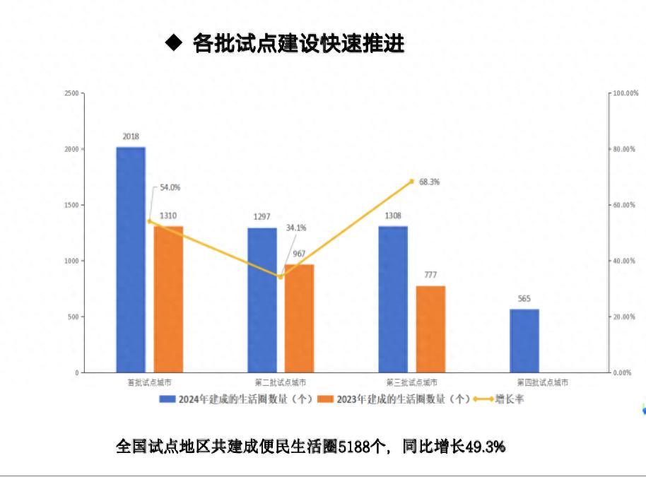 便民生活圈的建设有效带动了就业增长。截至2024年12月末,全国试点生活圈内的商业网点累计创造就业岗位732.4万个,同比增长44.9%。