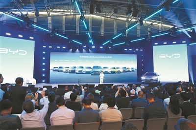 在展会上,中国车企比亚迪召开了盛大的产品推介会。本报记者 李山摄