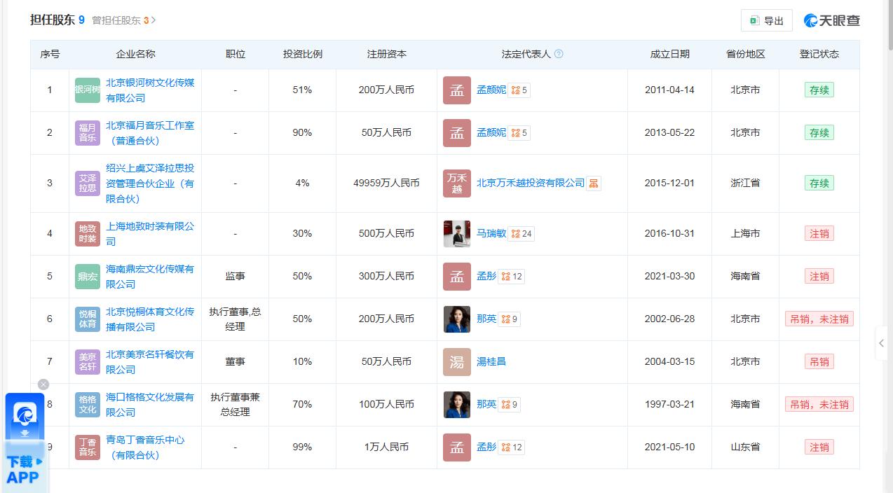 此外,那英名下关联9家企业,其中6家已注销,仅北京福月音乐工作室(普通合伙)、北京银河树文化传媒有限公司、绍兴上虞艾泽拉思投资管理合伙企业(有限合伙)为存续状态。