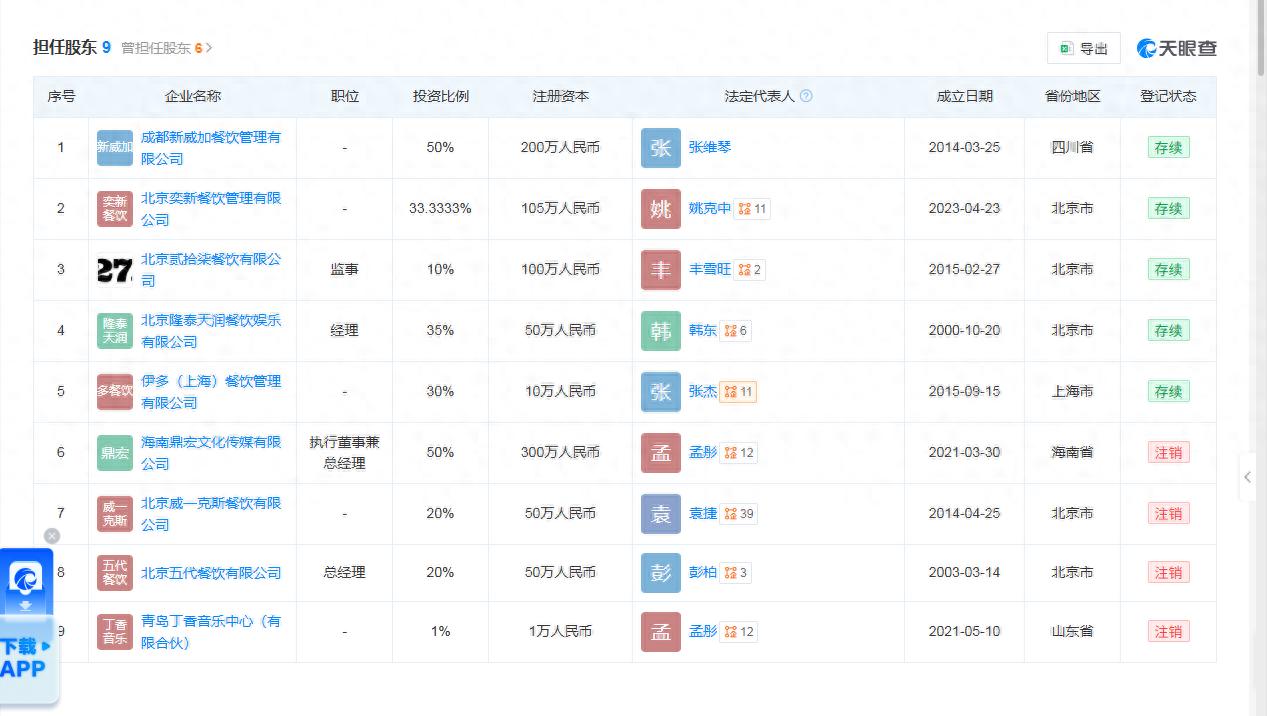 上述几家存续企业均选择不公示企业年报。那英老公孟彤名下关联12家企业,7家存续。其中,成都新威加餐饮管理有限公司多次被列入经营异常名录,孟彤持股50%。