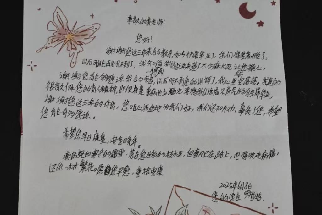 采访中,记者在罗智晗同学写给黄红梅的信里看到了这样一句话:“疾病宛如寒冬的霜雪,落在您生命的枝桠,但春风已在路上,它将吹走病痛,还您一树繁花。”