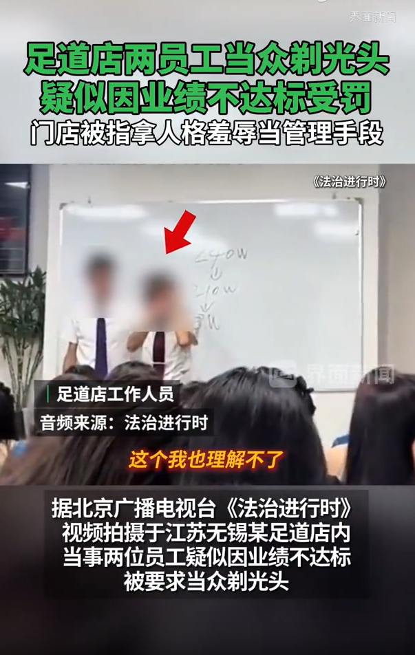 9月9日,两位员工当众剃头的视频流传网络,引发热议。 据北京广播电视台《法治进行时》,视频拍摄于江苏无锡某足道店内,当事两位员工疑似因业绩不达标被要求当众剃光头。 门店工作人员称,这是领导和他们打赌开的玩笑,有好几个员工参与,没想到他们真的剃了。 有网友质疑,称企业“不要拿人格羞辱作为管理手段”。