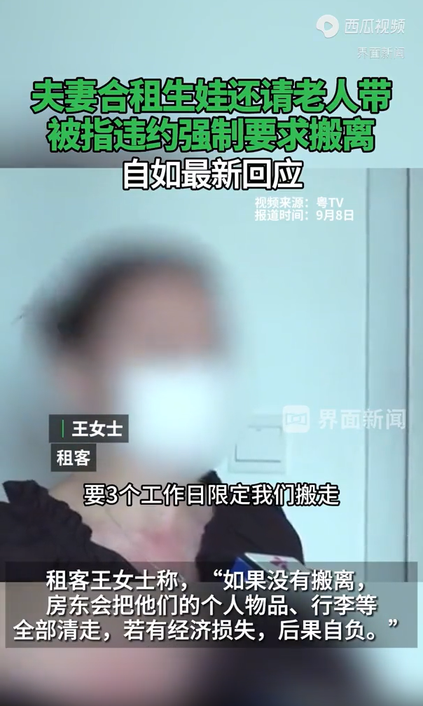 9月9日,据澎湃新闻报道,近日,广州白云区一对夫妻称在自如平台合租了套间中的一间房间,期间因生育小孩被指违反合同并要求限期搬离。租客王女士称,“如果没有搬离,房东会把他们的个人物品、行李等全部清走。” 9月9日晚间,@自如客服 发文回应称,公司既要考虑该租客及家人的居住体验,同时也要考虑其合租室友的居住体验。自如称上门看望了该租客及家人,并给予租客无责退租、搬家等多套解决方案,也协助调解其和室友之间的误解,但解决方案未获得租客认可。目前,街道、社区也已参与进来,进行多方协商。