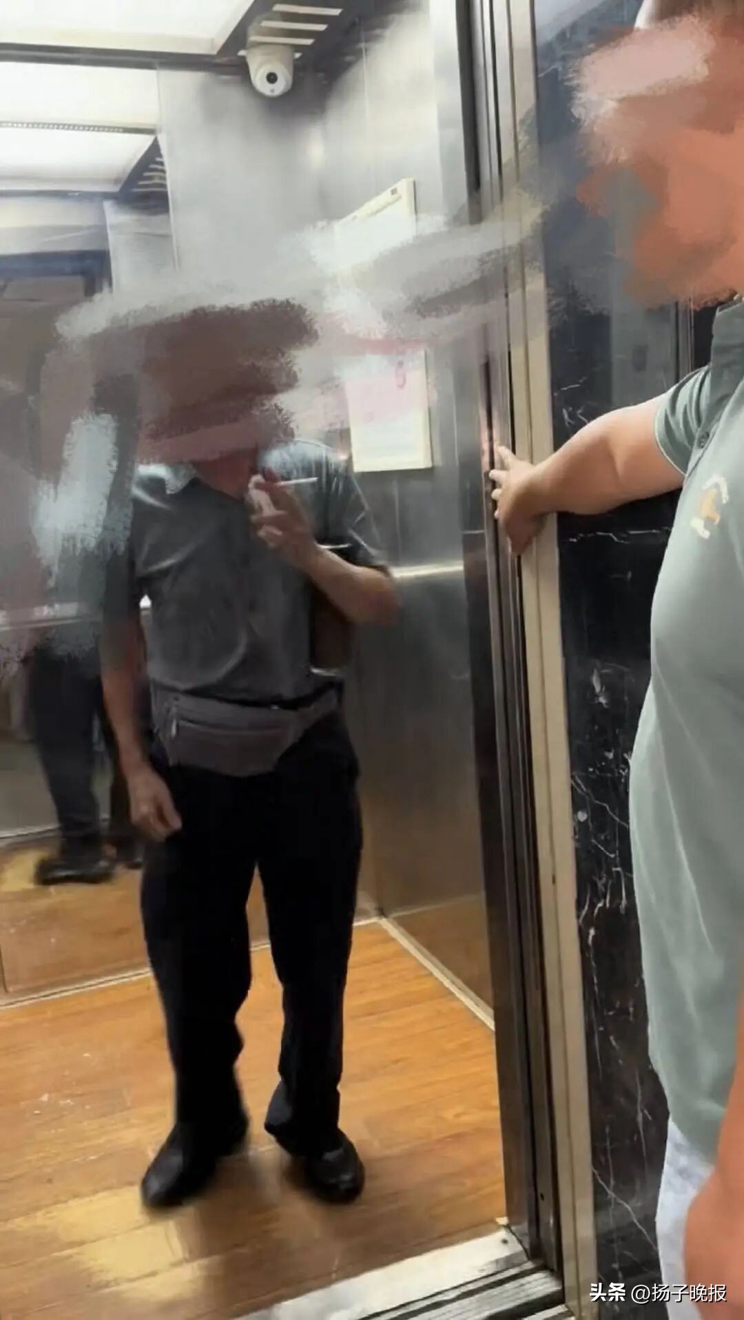 电梯里,地板上已经扔有抽过的烟头,大爷旁站着一位穿着物管衣服的工作人员,电梯外围着多位业主。业主们提醒大爷在电梯里抽烟不对,浓烈的烟味让邻居们身体不舒服,要求其将烟灭掉,或者离开电梯。