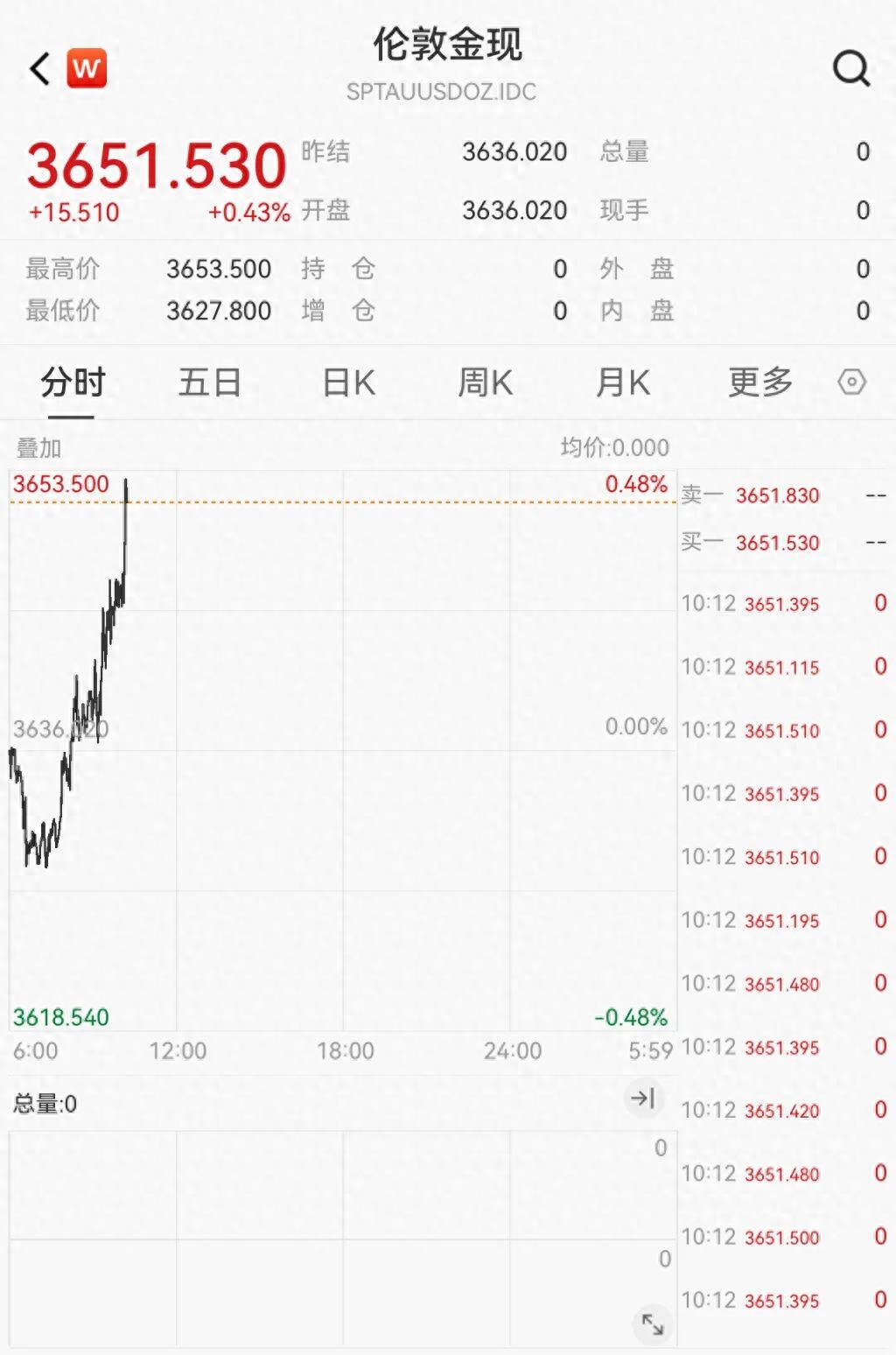 金价涨势不止,现货黄金价格突破3650美元/盎司。