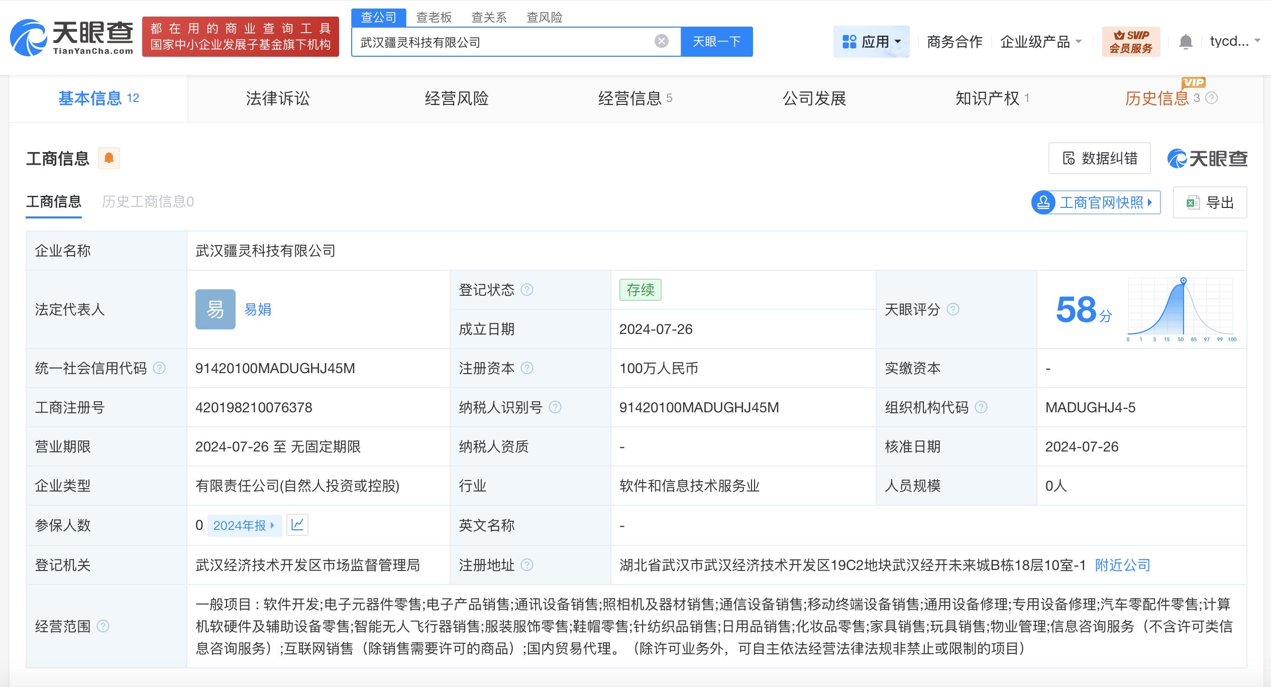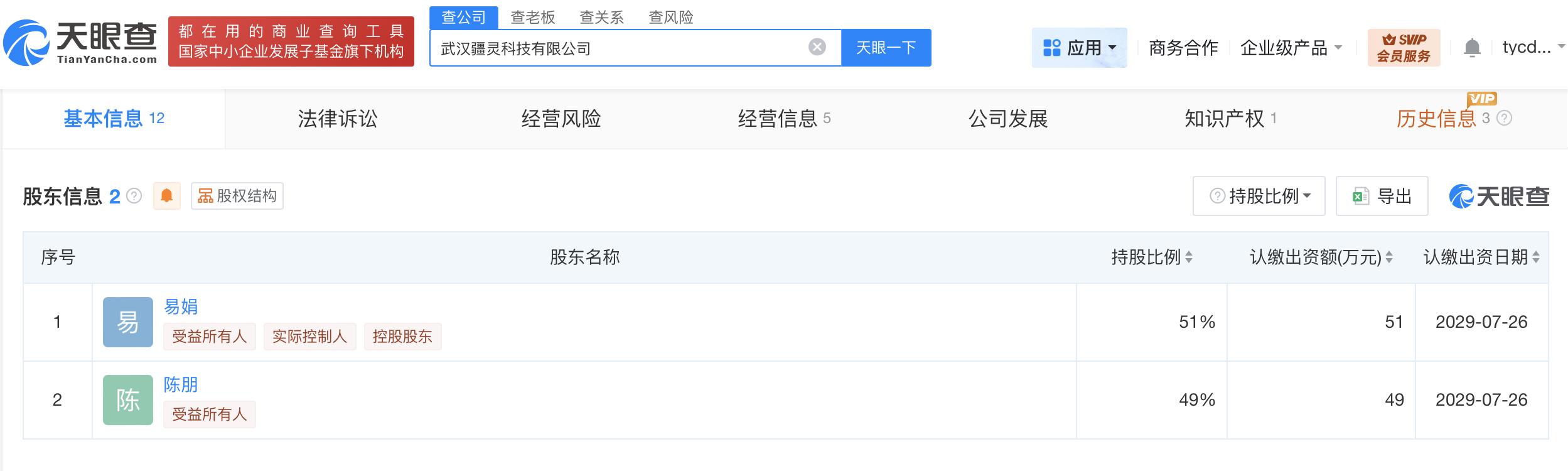 据媒体报道,33岁女子易娟维修无人机年入超500万引发网友关注。公开信息显示,当事人易娟关联公司为武汉疆灵科技有限公司。天眼查工商信息显示,武汉疆灵科技有限公司成立于2024年7月,法定代表人为易娟,注册资本100万人民币,经营范围包括软件开发、电子元器件零售、电子产品销售、通讯设备销售等。股东信息显示,该公司由易娟、陈朋分别持股51%、49%。年报信息显示,该公司2024年参保人数为0。知识产权信息显示,该公司已申请教育娱乐类“疆灵”商标,当前商标状态为等待实质审查。