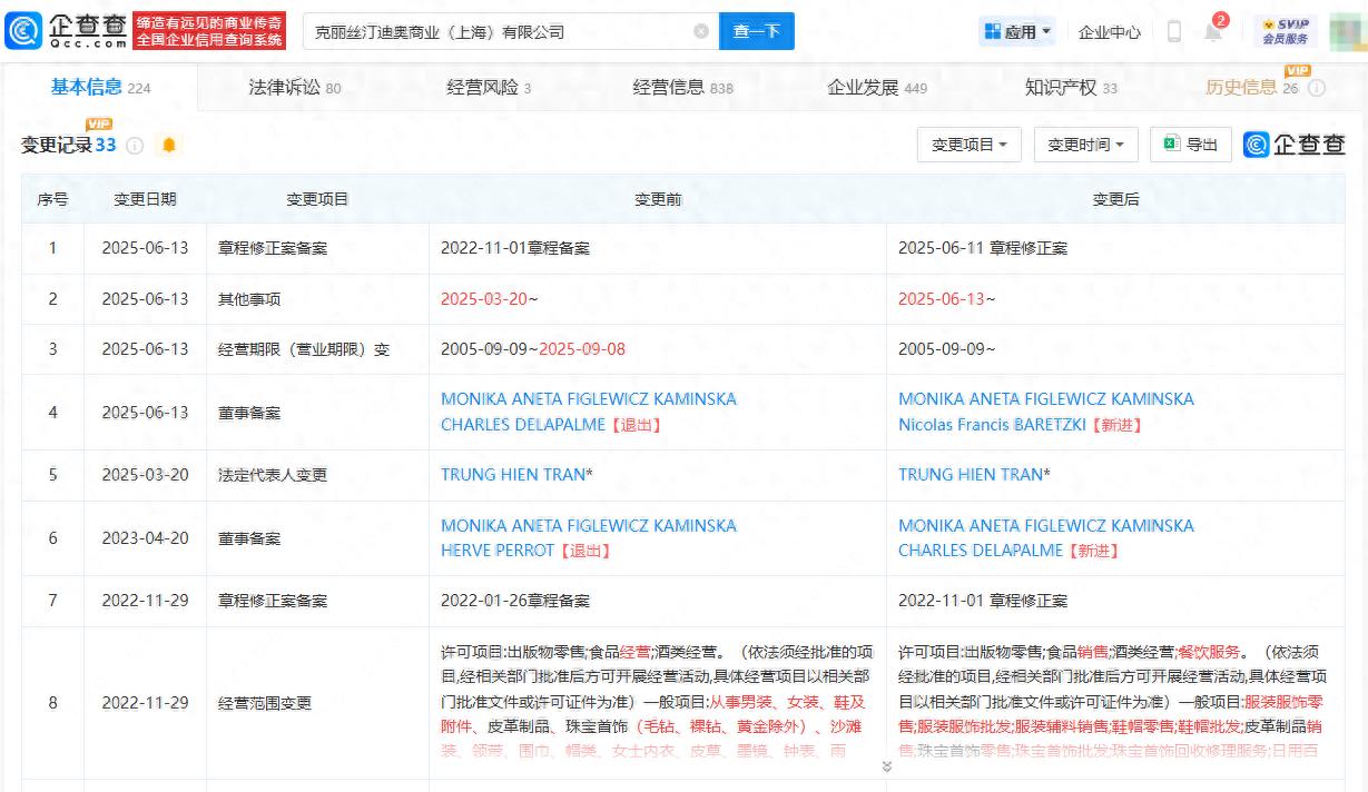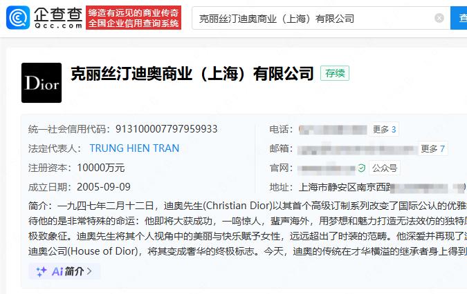 企查查APP显示,克丽丝汀迪奥商业(上海)有限公司成立于2005年9月。今年6月,该公司发生工商变更,原董事CHARLES DELAPALME卸任,新进Nicolas Francis BARETZKI担任董事职务。