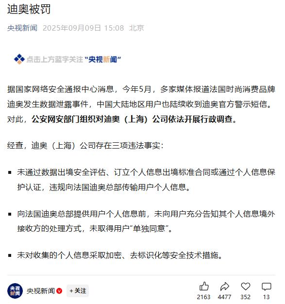 9月9日,国家网络安全通报中心消息,今年5月,多家媒体报道法国时尚消费品牌迪奥发生数据泄露事件,中国大陆地区用户也陆续收到迪奥官方警示短信。对此,公安网安部门组织对迪奥(上海)公司依法开展行政调查。经查,迪奥(上海)公司存在三项违法事实:一是未通过数据出境安全评估、订立个人信息出境标准合同或通过个人信息保护认证,违规向法国迪奥总部传输用户个人信息。二是向法国迪奥总部提供用户个人信息前,未向用户充分告知其个人信息境外接收方的处理方式,未取得用户“单独同意”。三是未对收集的个人信息采取加密、去标识化等安全技术措施。属地公安机关依据《个人信息保护法》规定,对迪奥(上海)公司依法予以行政处罚。