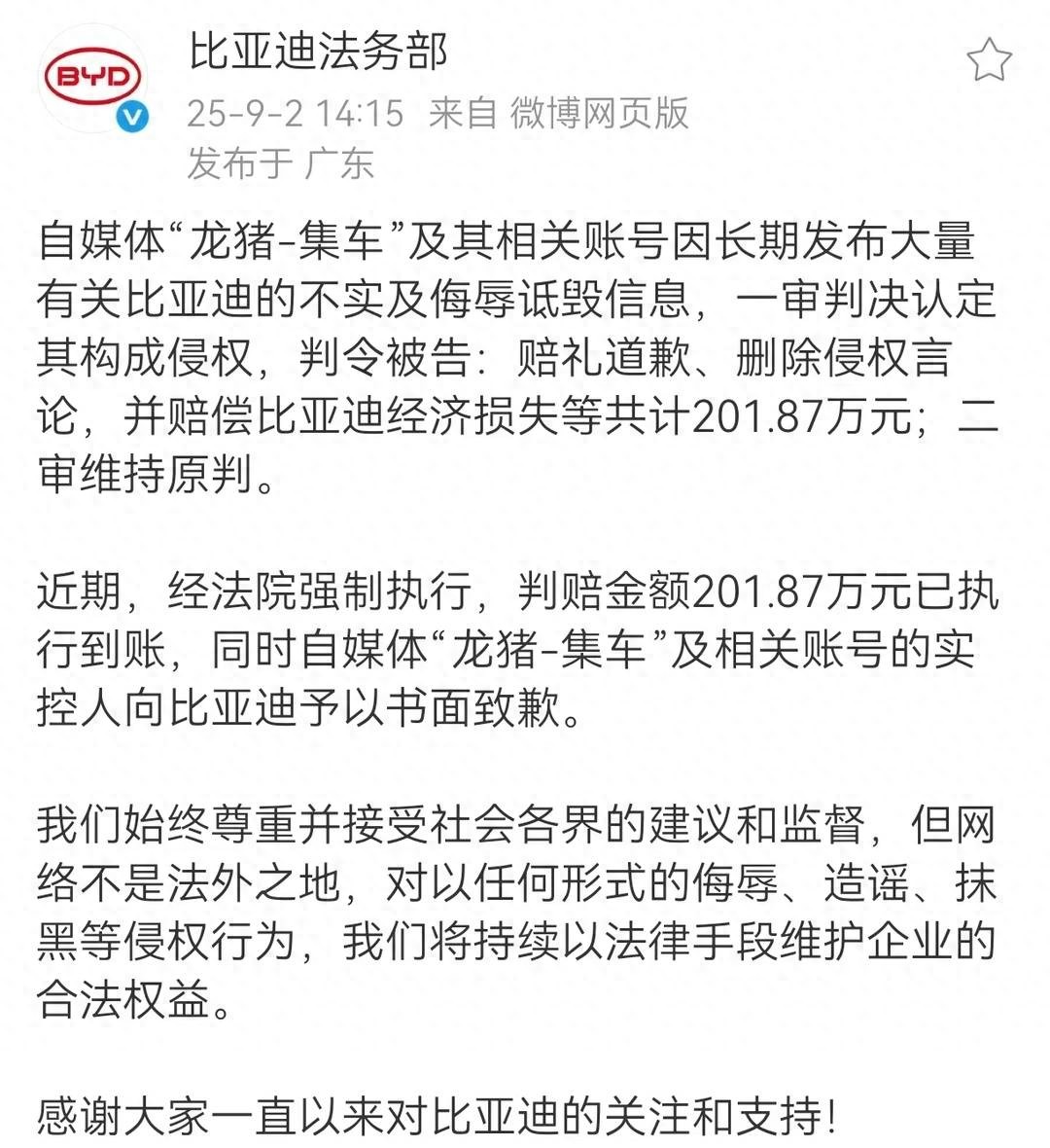 比亚迪作为新能源汽车领域的佼佼者,近年来销量屡创新高,成为行业领军者。处在这样的位置,难免成为舆论焦点和负面攻击的目标。为了捍卫公司权益,近两年来,比亚迪法务部、比亚迪网络举报中心先后对“龙猪-集车”、“彭彭在吗”、“生活家林小北”等自媒体账号及其所属MCN机构,发起了诉讼。其中,经法院强制执行,自媒体“龙猪-集车”判赔金额201.87万元已执行到账,同时自媒体“龙猪-集车”及相关账号的实控人向比亚迪予以书面致歉。