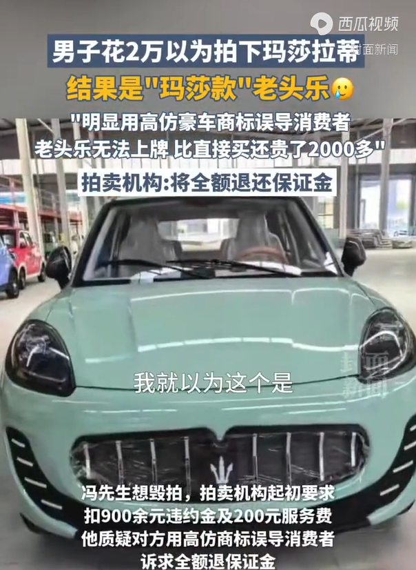 9月8日,来自广东的冯先生向封面新闻反映,6日在某线上拍卖平台,以19966元的价格竞拍了一辆“玛莎拉蒂”,竞拍成功后却发现是一辆高仿豪车的“老头乐”,与拍卖机构协商毁拍时,对方表示需支付违约金。拍卖机构向记者表示将全额退还保证金。同时,记者注意到,机构拍卖页面显示的几款等待开拍的高仿豪车老头乐信息,已被撤下。