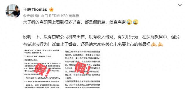 小米集团职业道德委员会发布的内部邮件显示,王腾因泄露公司机密信息,且存在利益冲突等严重违规违纪行为而被辞退。公司依据《小米集团员工违规违纪行为处理办法》《小米集团诚信廉洁守则》等制度规定,决定给予其辞退处分。这种公开通报高管违规处理的情况在科技公司中并不常见,凸显了小米对此事的重视程度。王腾本人在回应中表示:“感谢雷总和公司各位领导过去多年的培养和信任,非常不舍离开。未来仍然会一如既往的支持小米,支持REDMI。”
