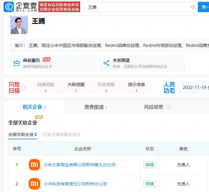 企查查任职信息显示,王腾名下关联2家企业,分别是小米科技有限责任公司郑州分公司、小米之家商业有限公司郑州第九分公司,王腾在上述两家企业担任负责人。截至9月9日,这些信息尚未变更。这意味着尽管王腾已经被小米辞退,但他在小米旗下分公司的负责人身份在法律层面上尚未更新。这种状况可能会随着时间推移而改变,小米公司很可能已经在着手处理相关事务。