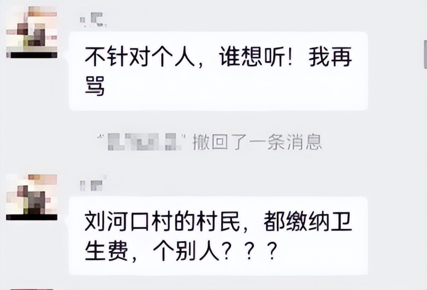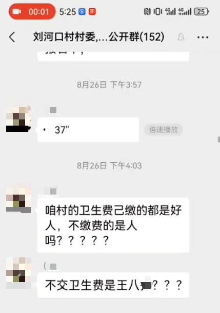8月26日(周二)下午3:57,一位包村干部为征收卫生费,在刘河口村委公开群里辱骂村民。