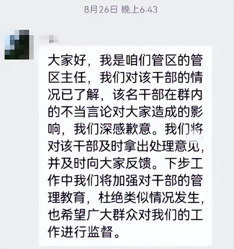 事发当晚,一位管区主任在群里向村民致歉,“我们对该干部的情况已了解,该名干部在群内的不当言论对大家造成的影响,我们深感歉意。我们将对该干部及时拿出处理意见,并及时向大家反馈。下步工作中我们将加强对干部的管理教育,杜绝类似情况发生,也希望广大群众对我们的工作进行监督。”