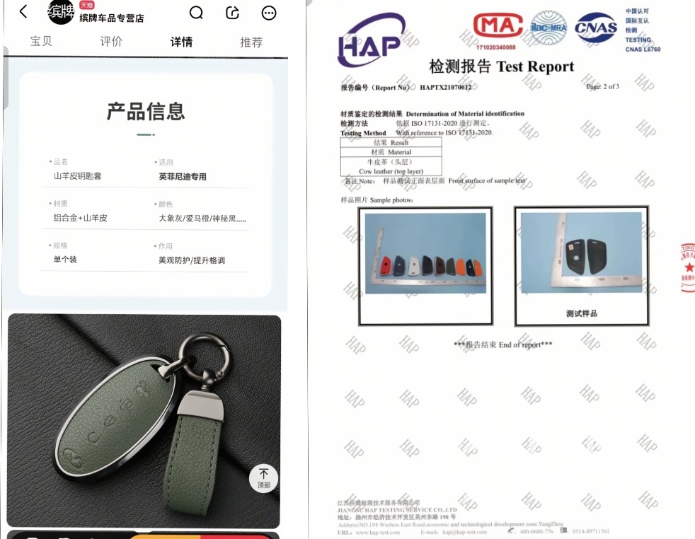 钥匙扣产品信息截图和检测报告截图。 (来源:受访者)