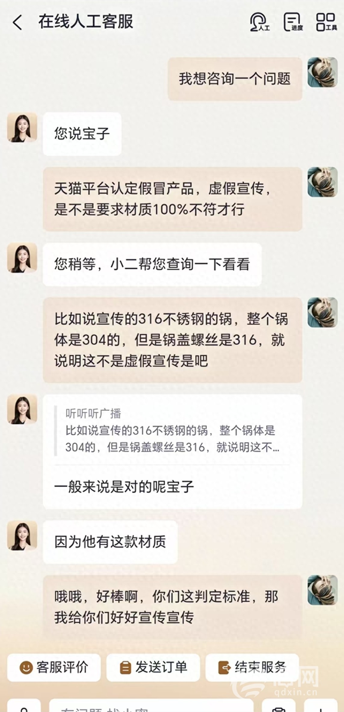 信网9月8日讯近日,消费者李先生在天猫平台购买了一个宣传材质为316不锈钢的锅,结果到手后,仅锅盖螺丝为316材质,锅体为304材质,李先生对此向客服提出质疑,询问这种情况是否不属于虚假宣传,客服回应称“一般来说是对的,因为商品有这款材质”。信网(0532-80889431)就该类问题咨询了天猫平台,客服拒绝对上述情况给出具体答复。