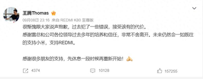 感谢雷总和公司各位领导过去多年的培养和信任,非常不舍离开。未来仍然会一如既往的支持小米,支持REDMI。