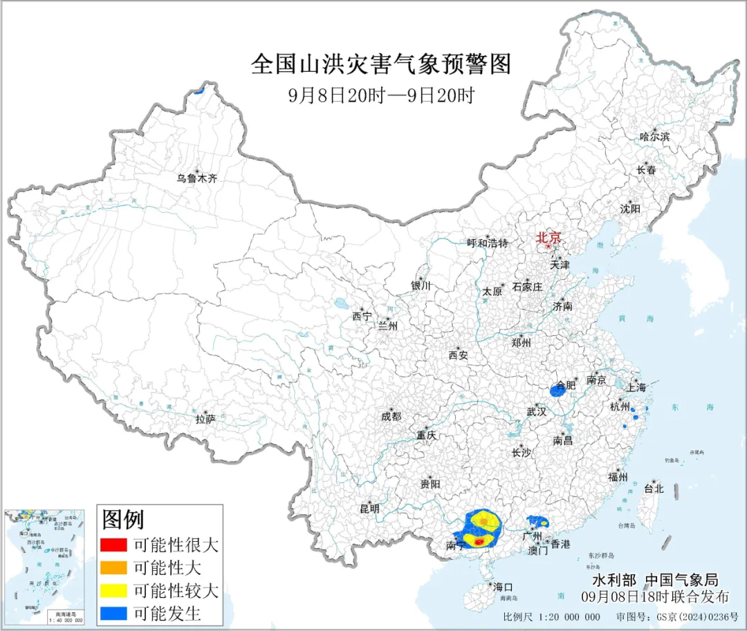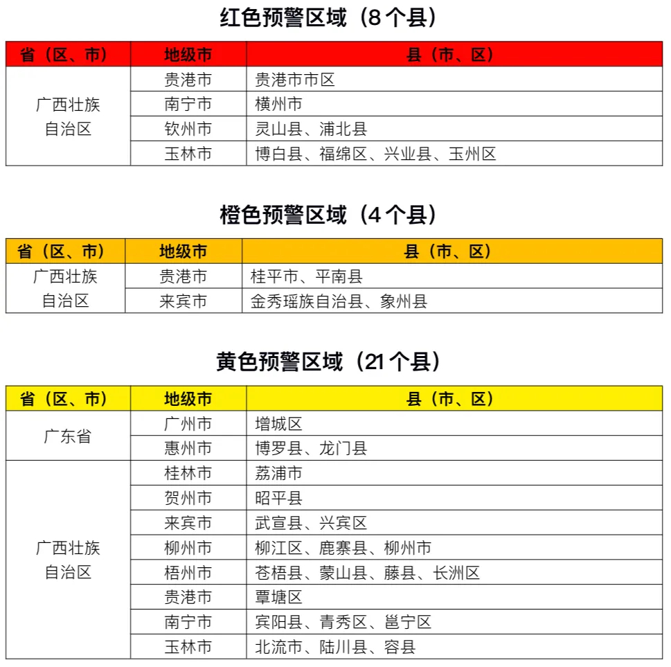 据中国水利微信公众号消息,水利部和中国气象局9月8日18时联合发布红色山洪灾害气象预警:预计,9月8日20时至9月9日20时,广西中部和东部等地部分地区发生山洪灾害可能性大(橙色预警),其中,广西东南部局地发生山洪灾害可能性很大(红色预警),预警区域涉及的县(市、区)见下表。其他地区也可能因局地短历时强降水引发山洪灾害,请各地注意做好实时监测、防汛预警和转移避险等防范工作。