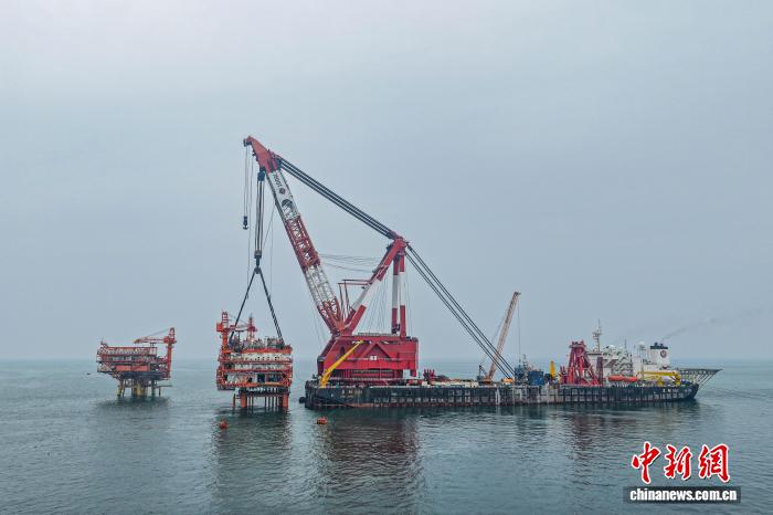 图为垦利6-1油田WHPJ井口平台海上安装现场。(中国海油天津分公司供图)