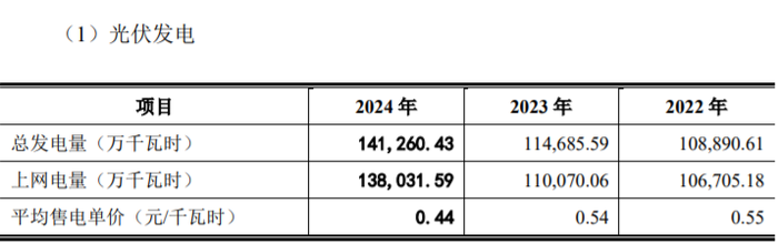 2022年至2024年,光伏发电的上网电量(万千瓦时)分别为10.67、11.01、13.8;平均售电单价(元/千瓦时)0.55、0.54、0.44。