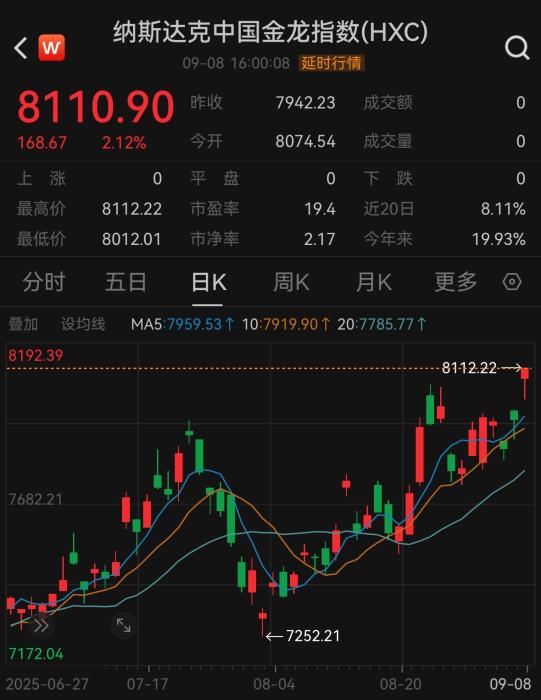 纳斯达克中国金龙指数收涨2.12%,报8110.9点,创下今年3月18日以来的新高。