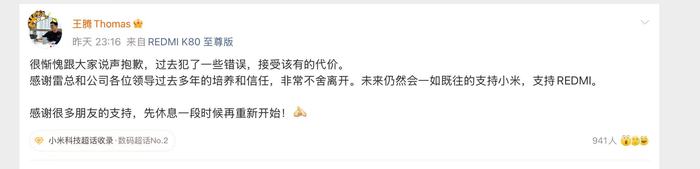 感谢雷总和公司各位领导过去多年的培养和信任,非常不舍离开。未来仍然会一如既往的支持小米,支持REDMI。
