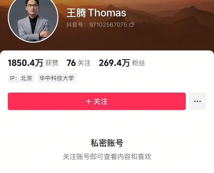 目前王腾的微博认证已经取消。界面新闻查阅其抖音账号,已设为私密账号,目前粉丝269万。其认证为小米中国区市场部总经理的快手账号已被封禁。