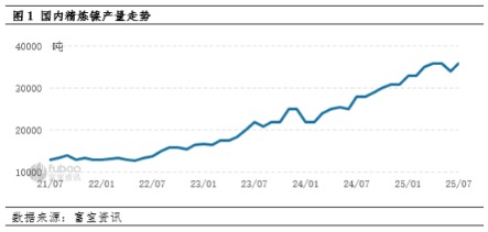 具体来看,精炼镍的传统检修季多集中在6-8月。数据显示,6月国内精炼镍产量在检修影响下出现下滑。但随着检修结束,7月产量回升明显。且从前七月的整体情况来看,2025年1-7月国内精炼镍产量24.3万吨,同比增加7.15万吨,增幅高达41.69%。在过去五年精炼镍一直处于增产状态,这导致镍价上行动力不足。