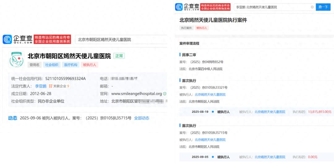 此前,8月20日,据大象新闻,企查查APP显示,近日,李亚鹏担任法定代表人的北京市朝阳区嫣然天使儿童医院(曾用名:北京嫣然天使儿童医院)新增被执行信息,执行标的1381.58万余元,执行法院为北京市朝阳区人民法院。当前,该医院名下涉多起司法案件,多为被告身份。