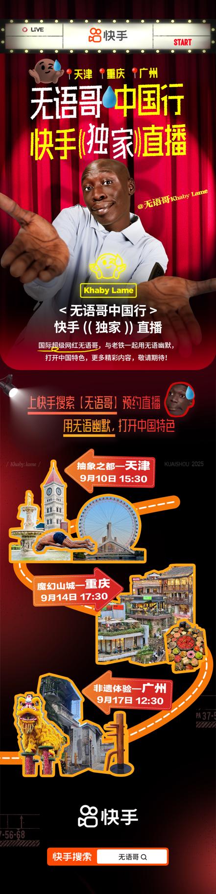 国际超人气网红“无语哥”Khaby Lame 9月份将开启中国行,此次中国行将到天津、重庆、广州等城市,在快手开启独家直播。