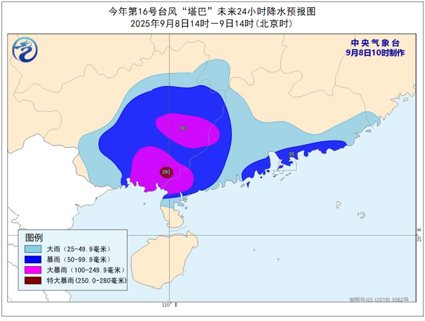 降水预报:9月8日14时至9日14时,广东西部和南部沿海、广西中东部有暴雨到大暴雨,其中,广西东南部局地有特大暴雨(250-280毫米)。广东今天(8日)进入最强降雨时段;广西降雨最强时段将出现在9日。