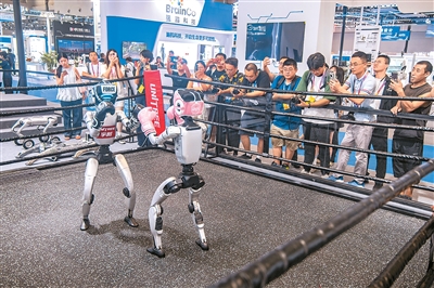 9月4日,媒体记者和嘉宾在2025世界智能产业博览会宇树科技展厅观看机器人拳击赛。新华社记者 唐 奕摄