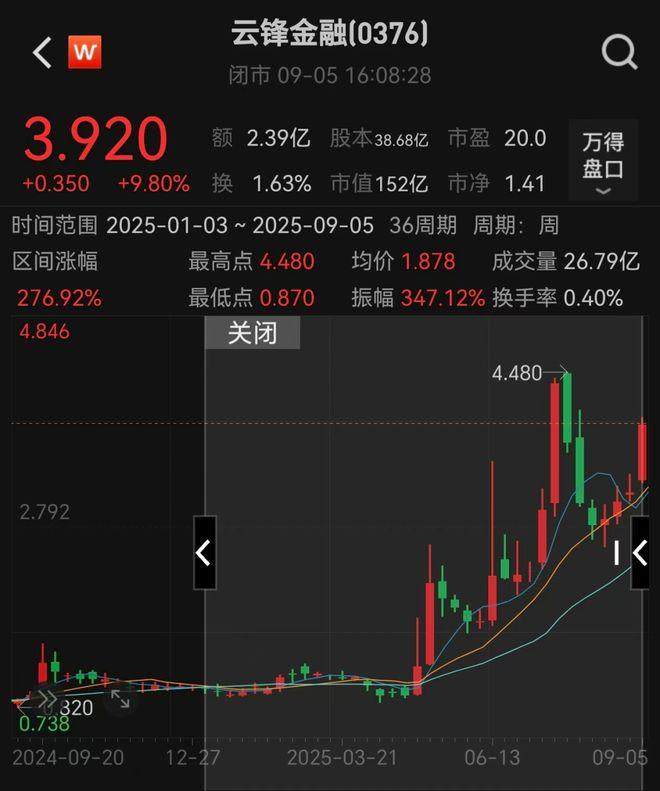二级市场上,截至9月5日收盘,云锋金融年初至今股价累计大涨近277%。