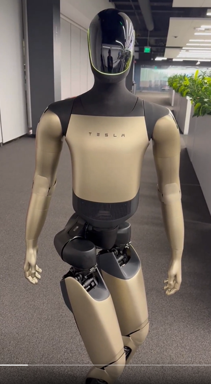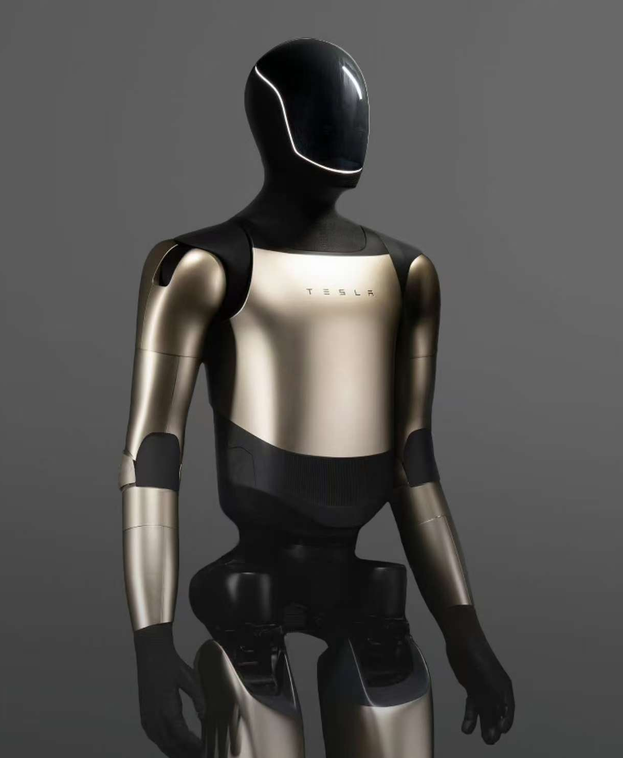 综合特斯拉给出的内容,与前两代机器人相比,这款Optimus机器人在外形上更加简约、流畅、精致,主体选取土豪金配色,整体体积更小。