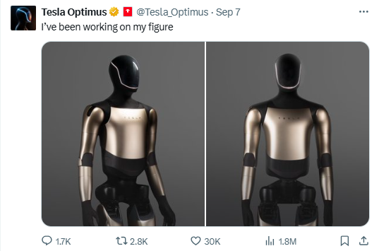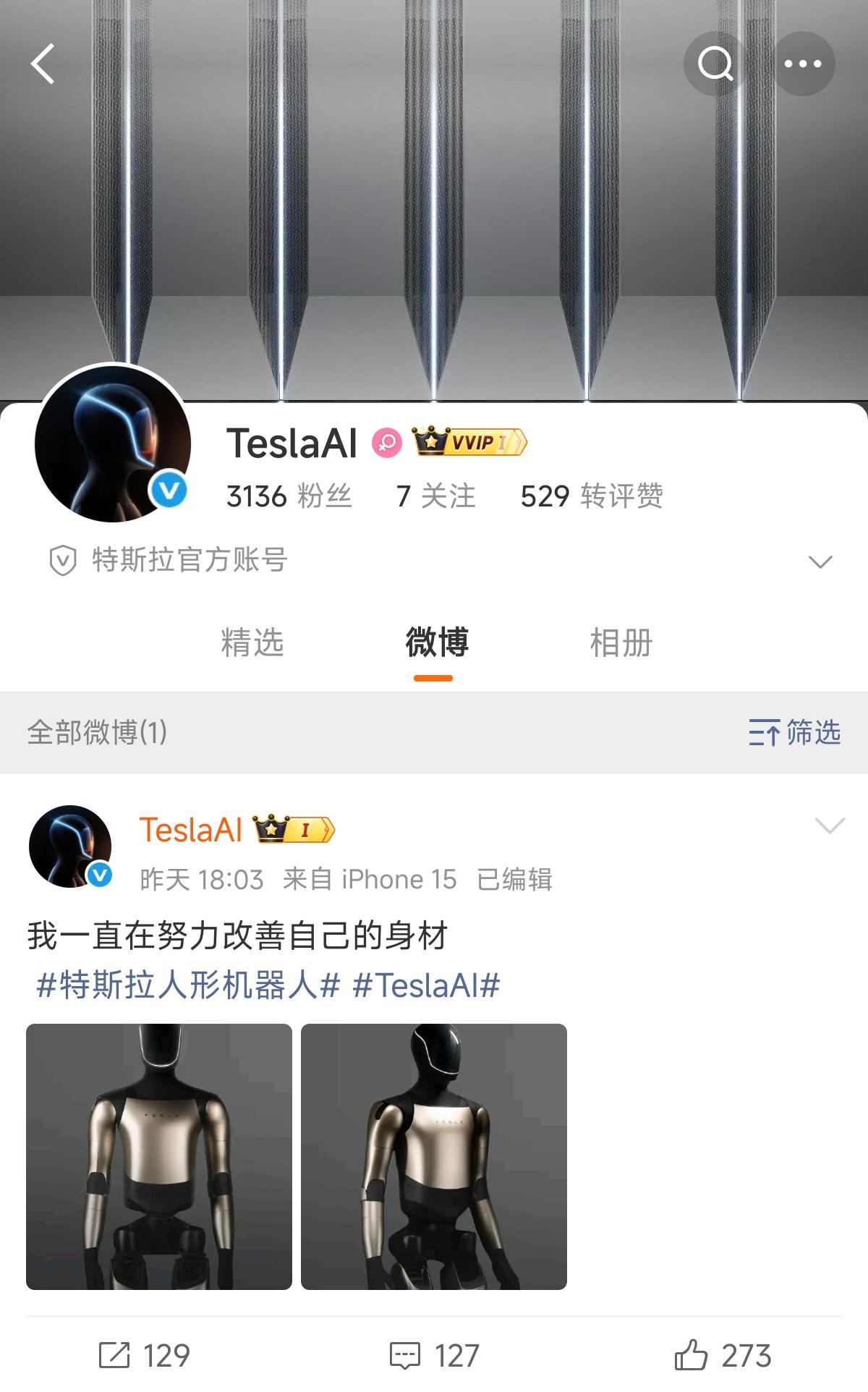 9月7日,特斯拉开通名为“Tesla AI”的微博账号,并发布首条微博“我一直在努力改善自己的身材”,展示了新版本的Optimus人形机器人。