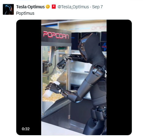 在发布金色机器人照片的同一天,Tesla Optimus还发布了一段视频,名为“爆米花时间”,展示全黑款2.0版本特斯拉机器人如何在餐厅“打工”。视频中的机器人熟练为顾客盛取爆米花(虽然仍有少量爆米花掉落)、比剪刀手合照、打招呼以及挥手告别。