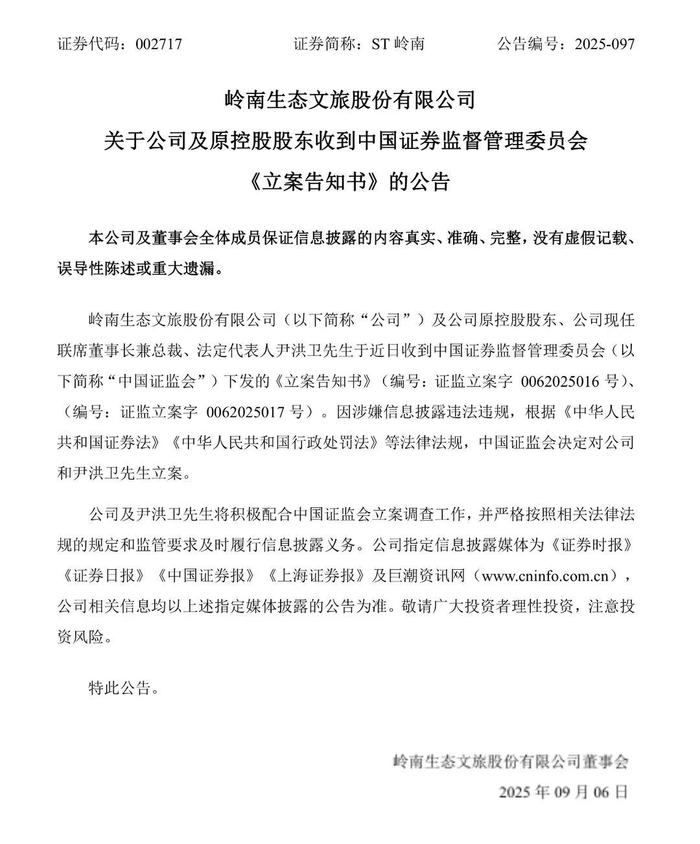 9月6日,岭南生态文旅股份有限公司(简称ST岭南)发布关于公司及原控股股东收到中国证券监督管理委员会《立案告知书》的公告。