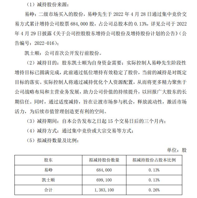 根据公告,易峥、凯士顺此次分别拟减持不超过68.40万股、69.91万股股份,拟减持股份占股本比例均为0.13%。减持时间为2025年9月29日至2025年12月28日,减持方式为集中竞价交易方式或大宗交易方式,减持价格区间将根据市场价格确定。
