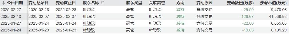 今年以来,第二大股东叶琼玖(现任公司董事兼副总经理)也完成了共计200万股(占总股本的0.37%)的减持,减持均价318.87元,合计减持市值6.38亿元。