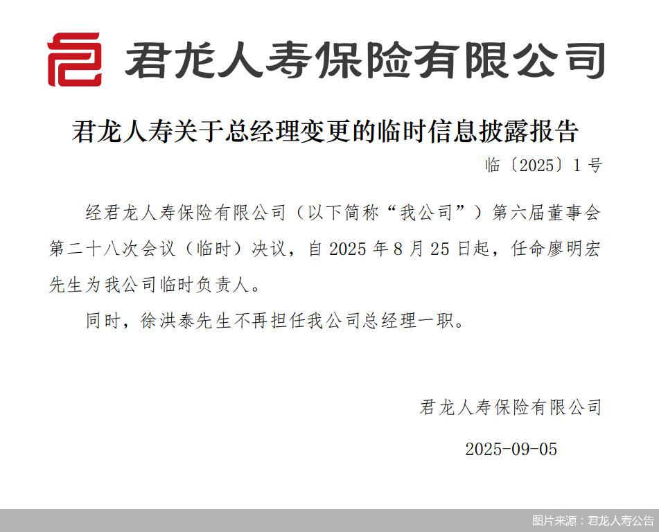 9月6日,北京商报记者注意到,君龙人寿保险有限公司(以下简称“君龙人寿”)日前公告,自8月25日起,任命廖明宏为公司临时负责人。同时,徐洪泰不再担任公司总经理一职。