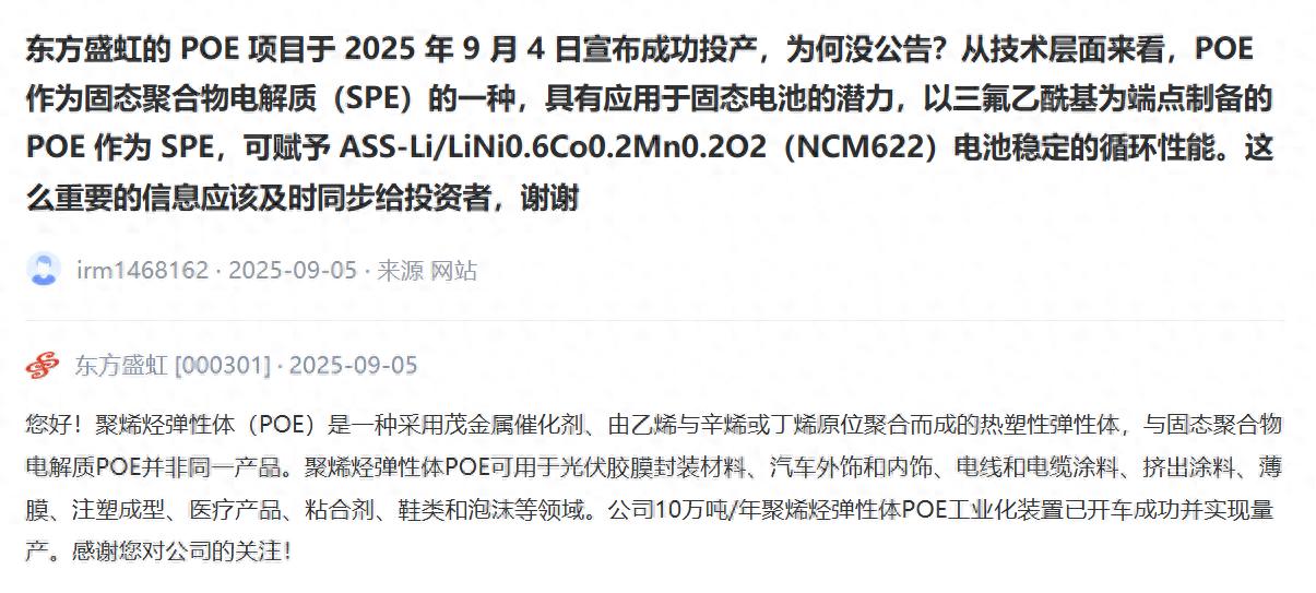 近日,有投资者在互动平台向东方盛虹(000301)发问:公司POE 项目于2025年9月4日宣布成功投产,为何没公告?