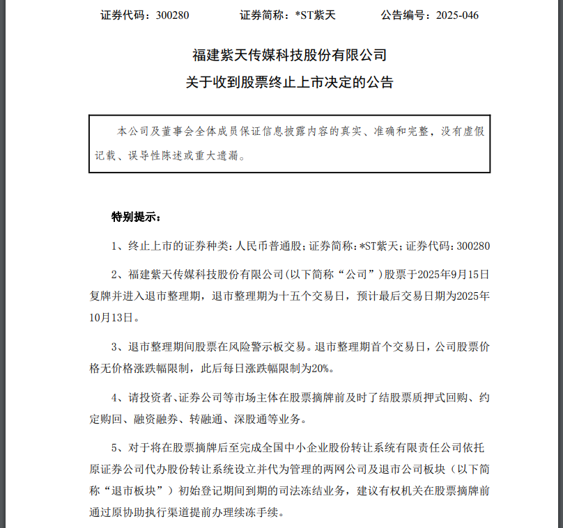 9月5日晚间,*ST紫天发布公告称,公司当日收到深交所下发的《关于福建紫天传媒科技股份有限公司股票终止上市的决定》,深交所决定终止公司股票上市交易。