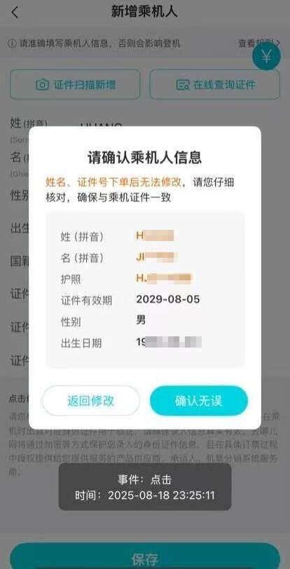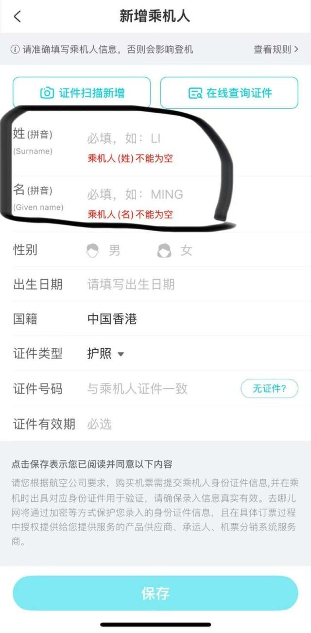葛女士认为,之所以出现这种差错,是因为去哪儿网购票页面引导不当所致。据葛女士提供的去哪儿网平台新增乘机人信息填写界面截图显示,填写姓名的两栏区域,平台都以“姓(拼音)与名(拼音)”标注。葛女士表示,她第一反应就是按姓名中文拼音填写的,这种失误是由平台误导所致,“平台理应出面解决”。