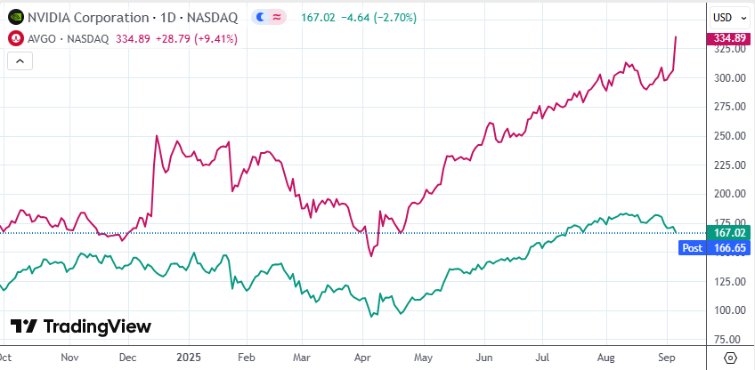 “今天两者的分化看起来有点极端,但英伟达在过去三年一直是AI的代表企业。虽然我不认为市场对它降温,但投资者正在把目光拓展到其他AI赢家身上。博通算是一个相对崭新的亮点。”