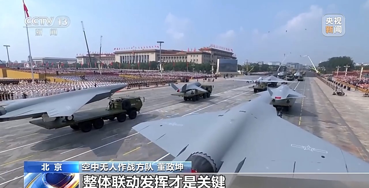阅兵当天,伴着雄壮的《无人智胜》进行曲,10架无人战鹰,乘着铁甲洪流以振翼高飞之姿、鹰览云海之势,威武雄壮驶过长安街,光荣接受了党和人民检阅。