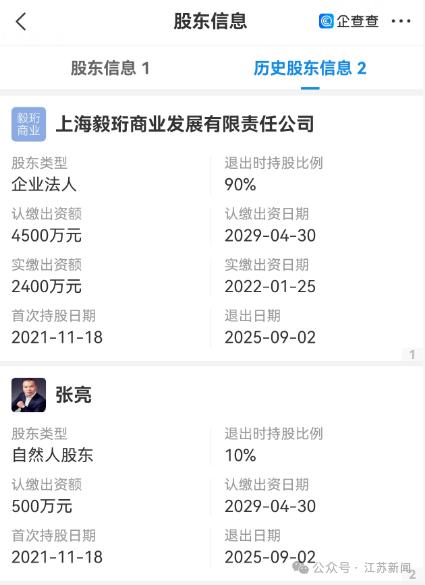 原股东上海毅珩商业发展有限责任公司(持股90%)和创始人张亮(持股10%)退出股东行列。