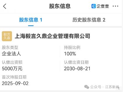相关信息显示,上海毅言久鼎企业管理有限公司成立于2025年,注册资本100万元人民币,法定代表人和最终受益人为张亮,主要从事商务服务业。注册于中国香港的盛世千秋有限公司是其控股股东,持股比例100%,该公司成立于2024年。
