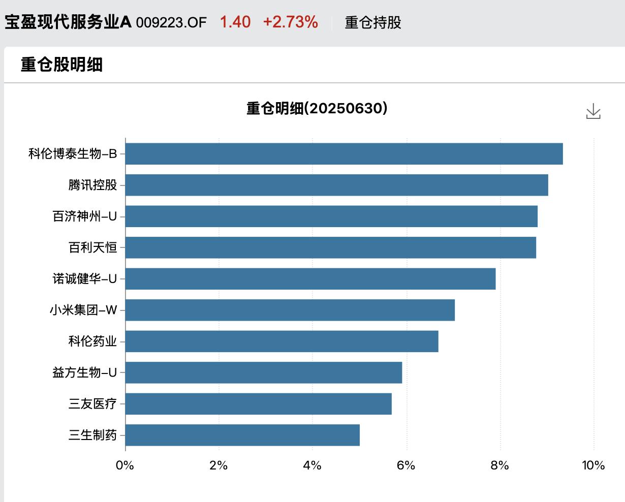 截至今年二季度末,宝盈现代服务业混合前十大重仓股为科伦博泰生物-B、腾讯控股、百济神州-U、百利天恒、诺诚健华-U、小米集团-W、科伦药业、益方生物-U、三友医疗、三生制药,大部分为医药生物行业相关个股。