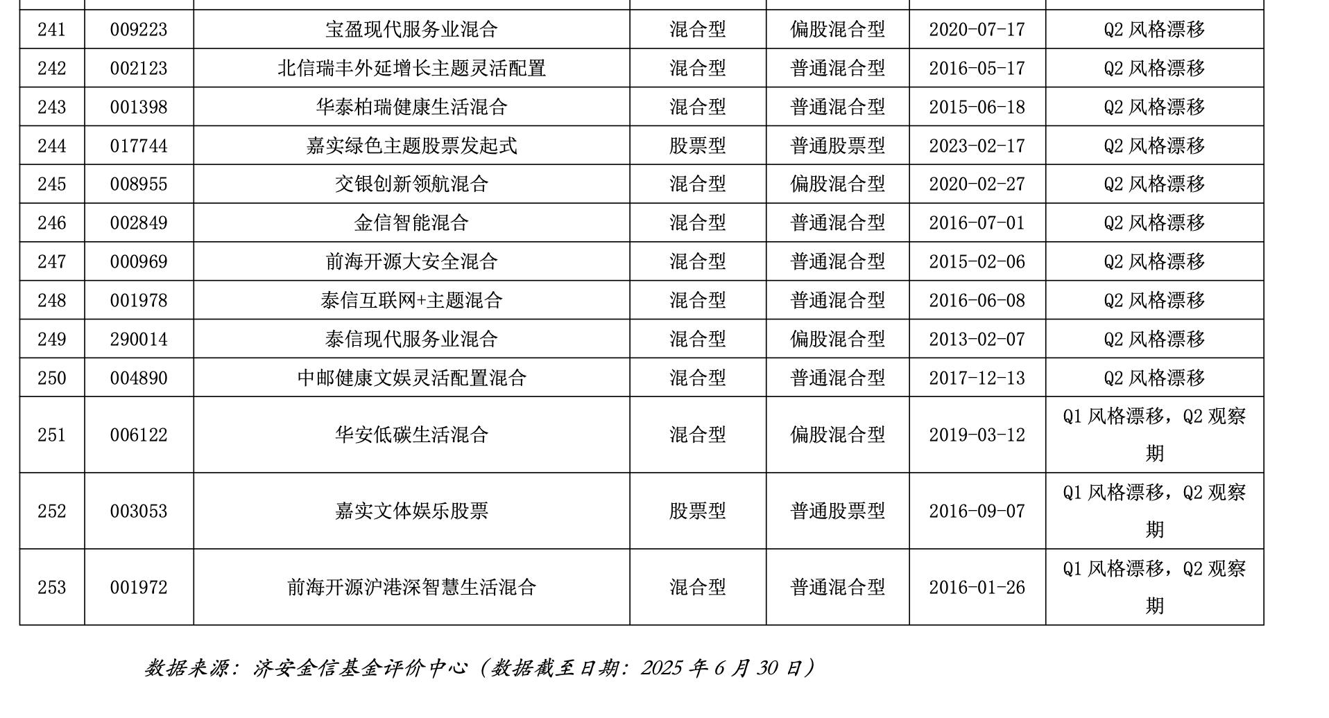 近日,第三方基金评价机构济安金信发布《关于2025年第二季度不予评价基金的说明》,部分基金被剔除评级。其中华泰柏瑞健康生活混合、宝盈现代服务业混合等10只基金因二季度“风格漂移”被不予评级。